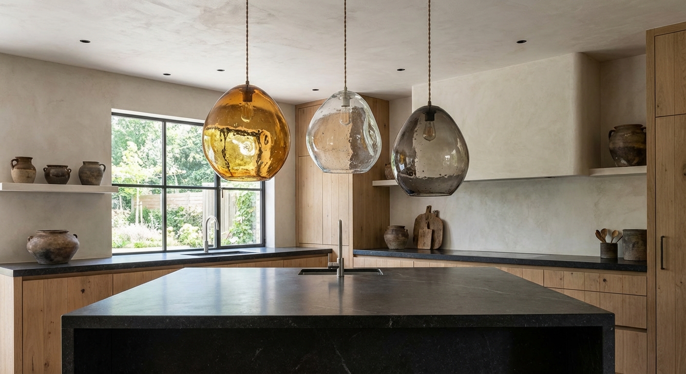 Visual Concept: Three large, asymmetrical hand-blown glass pendants hanging at different heights over a dark stone kitchen island.