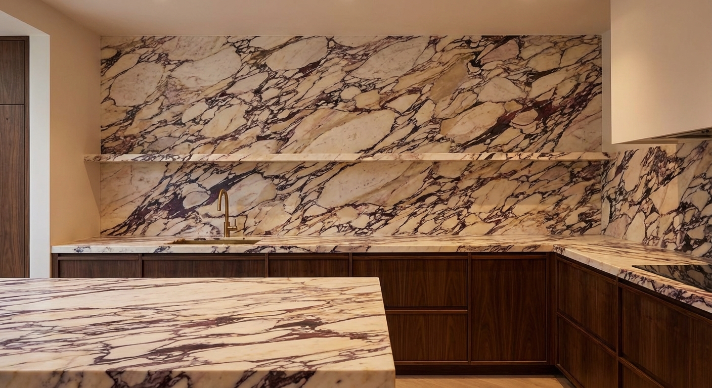 Visual Concept: A dramatic Calacatta Viola marble countertop that extends seamlessly up the wall to the ceiling, uninterrupted by upper cabinets.
