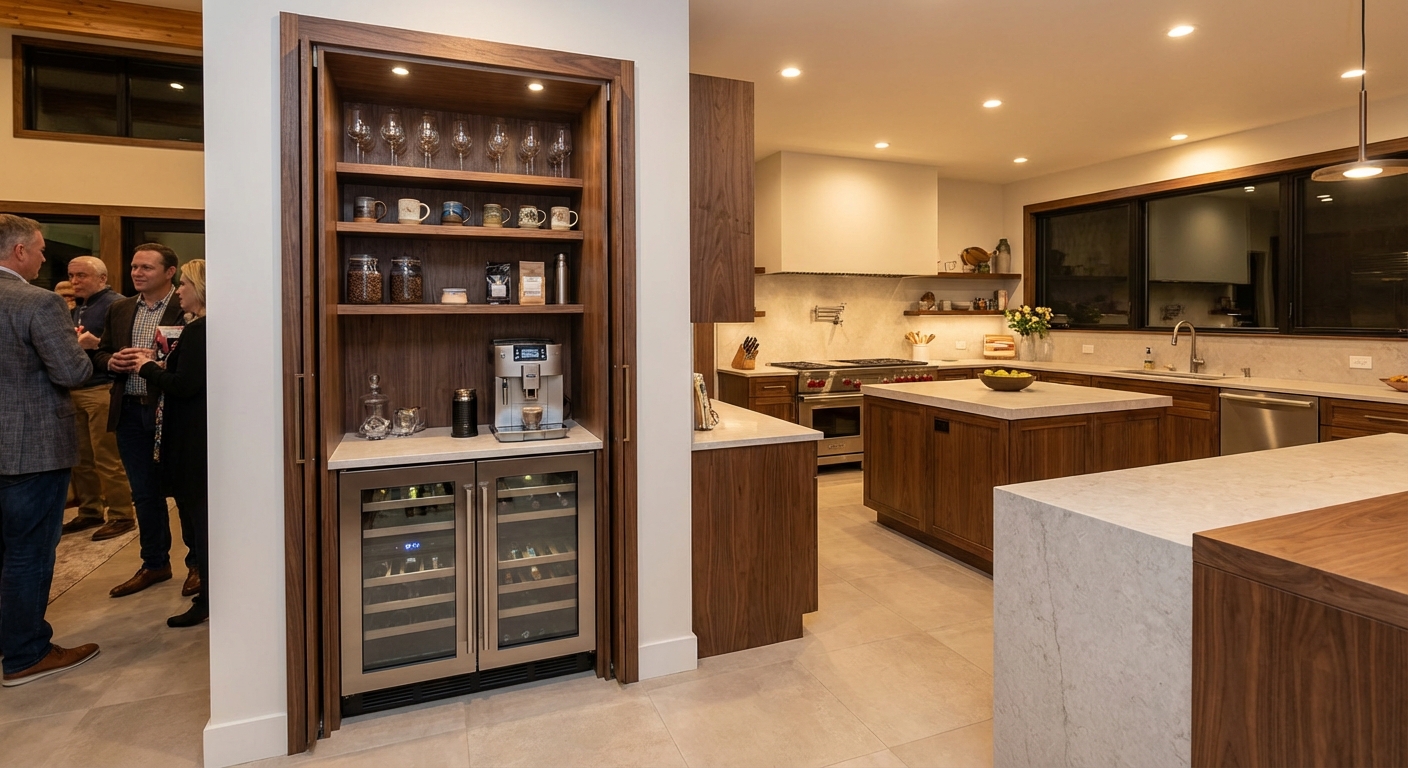 Visual Concept: A bi-fold cabinet door open to reveal a lit coffee station and toaster, then closed to look like a seamless wood panel.