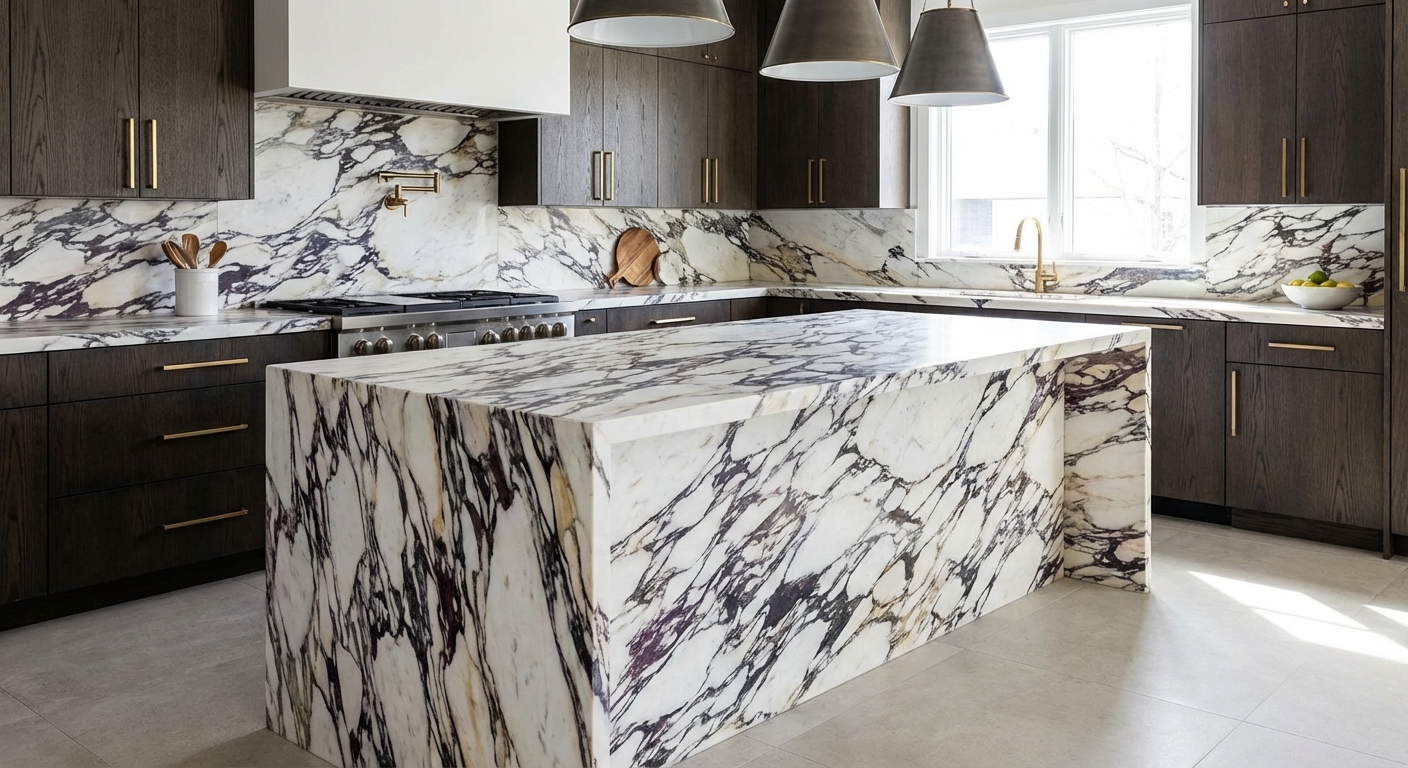 Visual Concept: A waterfall island featuring white marble with thick, dramatic purple and black veins.