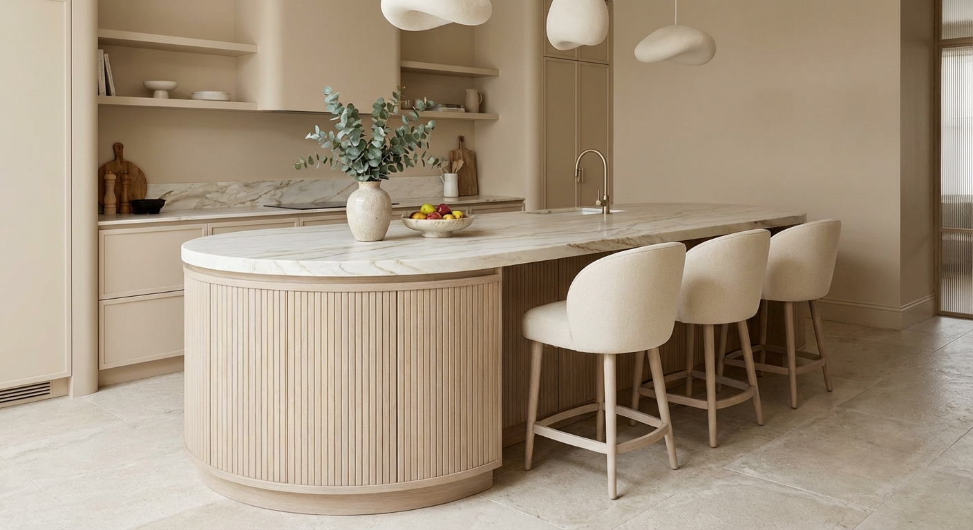 Visual Concept: A large, pill-shaped kitchen island in white oak with a ribbed texture base, topped with a soft-veined marble, set against a warm beige kitchen.