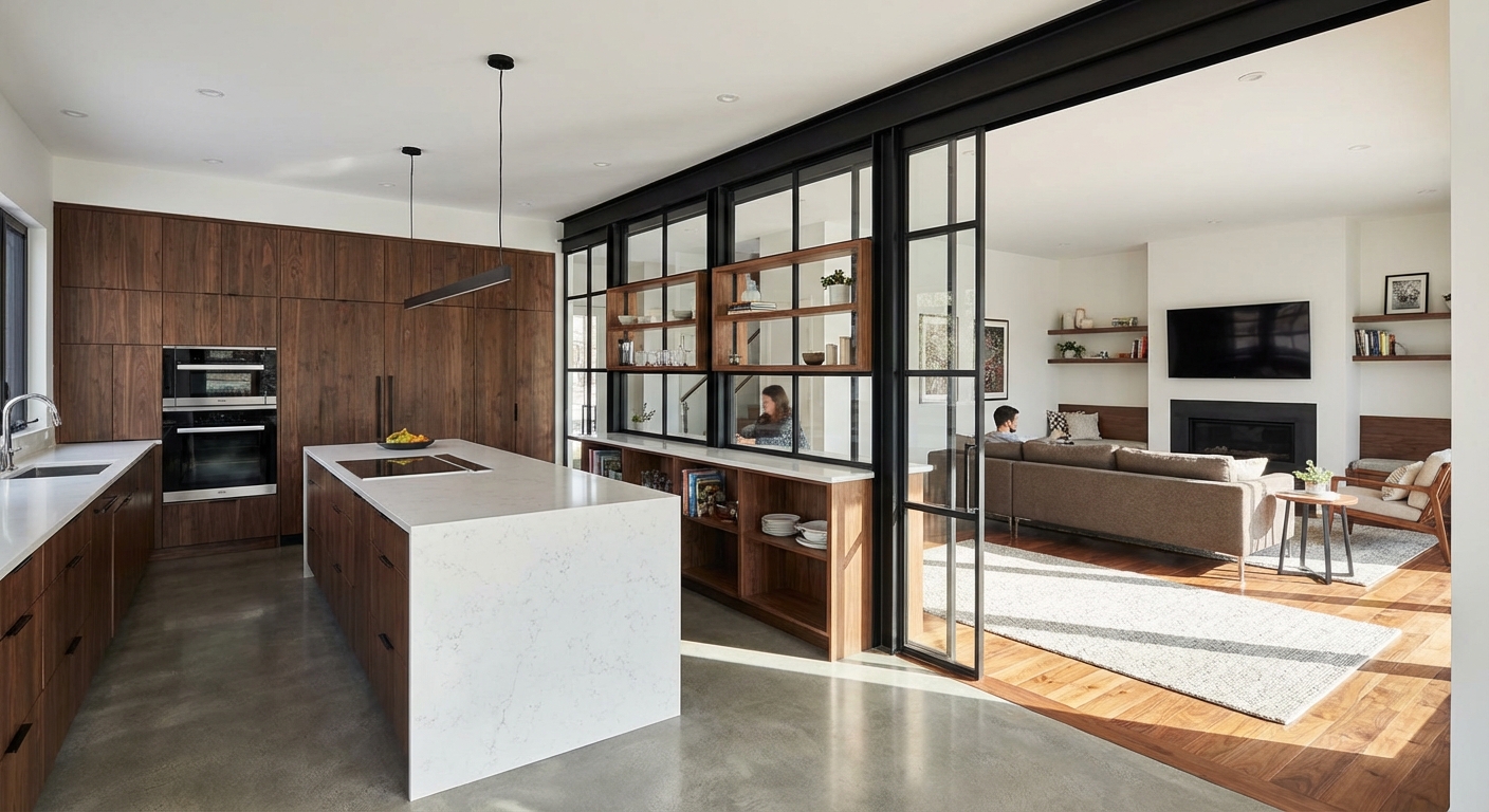 Visual Concept: A kitchen separated from the living room by a steel-framed glass partition wall, maintaining light but blocking noise.