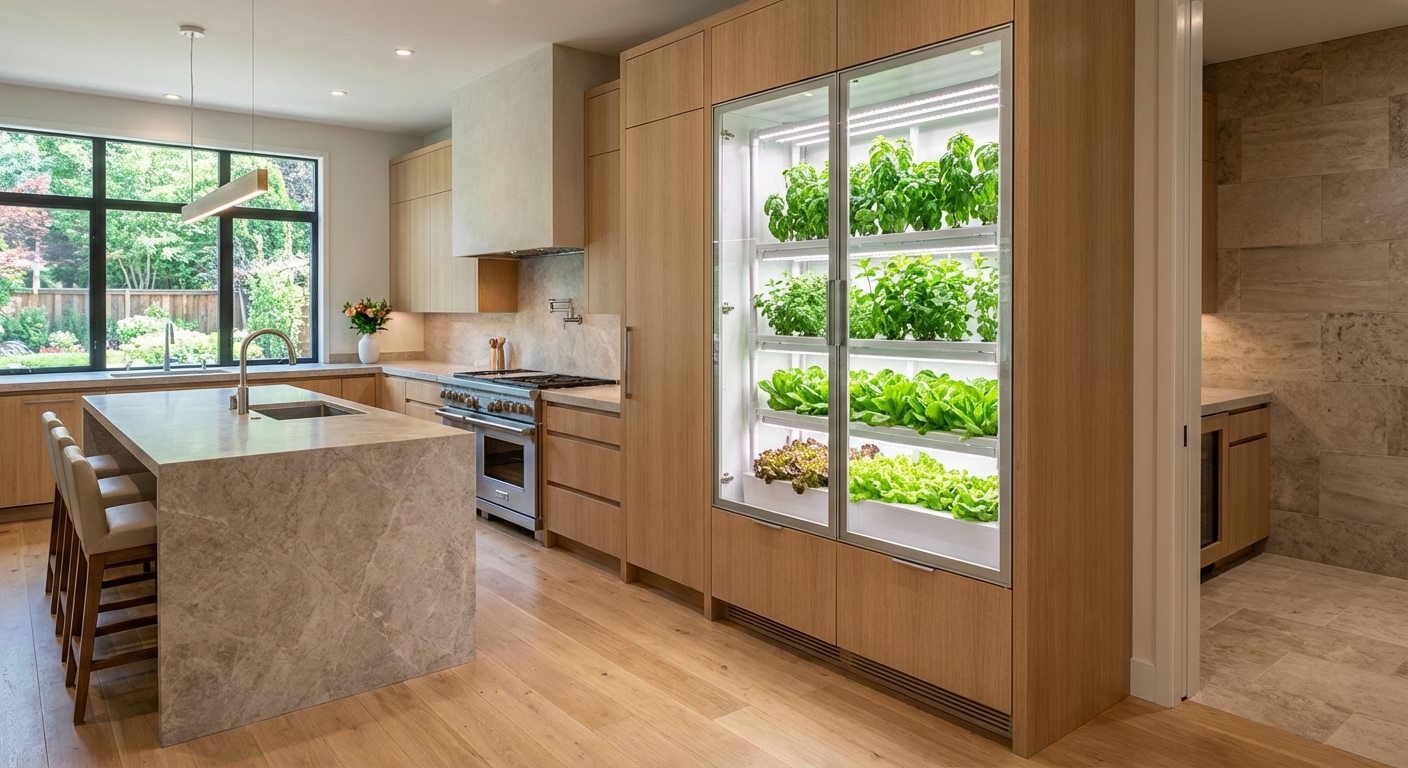 As "farm-to-table" becomes "counter-to-table," built-in hydroponic gardens are becoming a luxury staple. These are vertical glass cabinets with grow lights and irrigation systems, allowing you to grow fresh basil, mint, and microgreens right in your kitchen year-round.