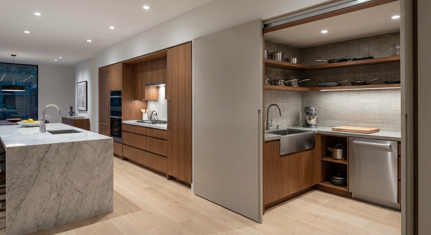 The open-concept kitchen is beautiful, but nobody wants their guests to see dirty pots and pans. Enter the Scullery or "Prep Kitchen."This is a secondary, smaller room hidden behind a "secret" door in the main cabinetry where the messy work chopping, washing, frying happens.
