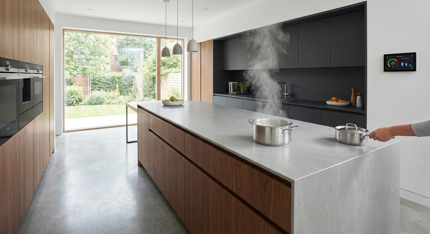 Gas is slowly being phased out in modern eco-conscious homes. The star of 2026 is Induction Technology, specifically "invisible" cooktops where the induction elements are integrated directly under the stone countertop. You can cook right on the counter, and when you're done, it's just a flat surface for serving.