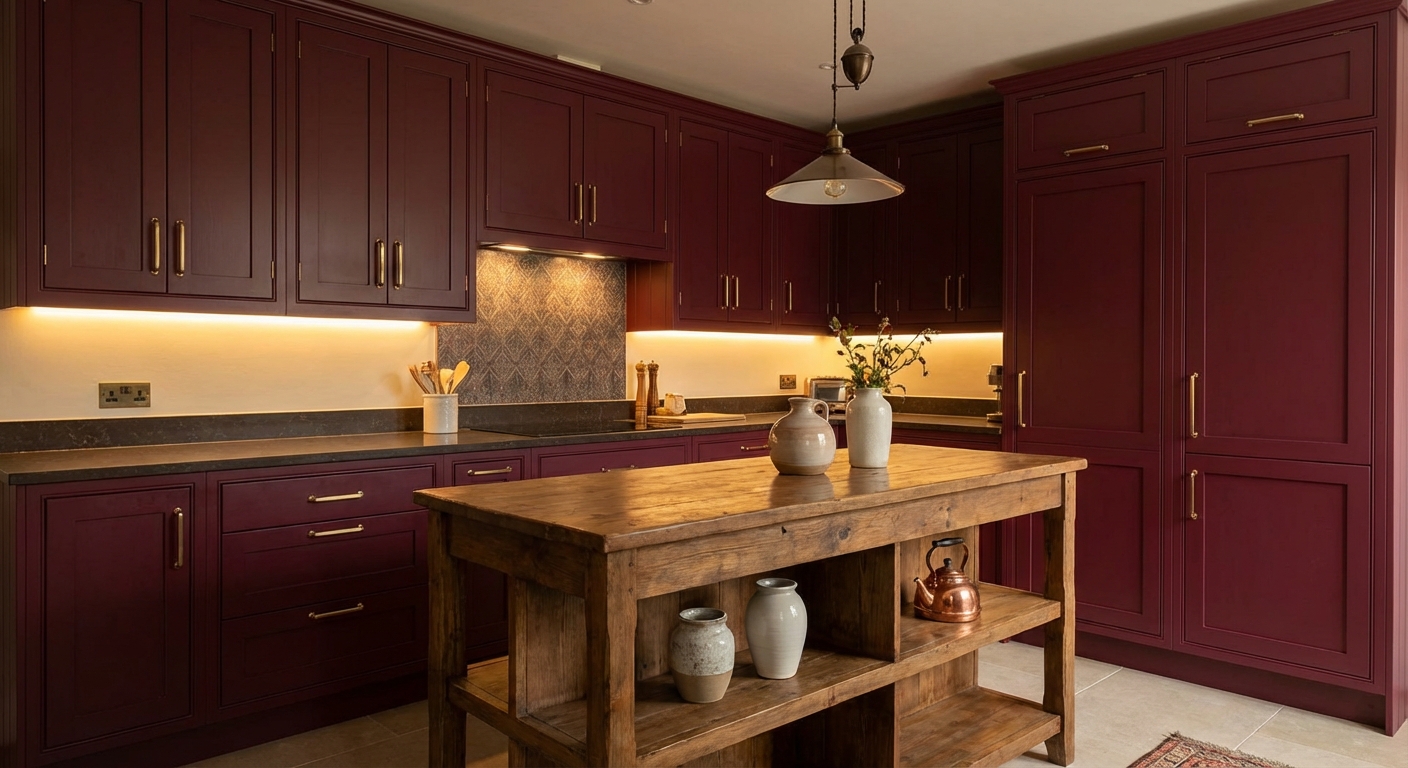 Visual Concept: Floor-to-ceiling kitchen cabinetry painted in a deep, rich burgundy with brass hardware, illuminated by warm under-cabinet lighting.