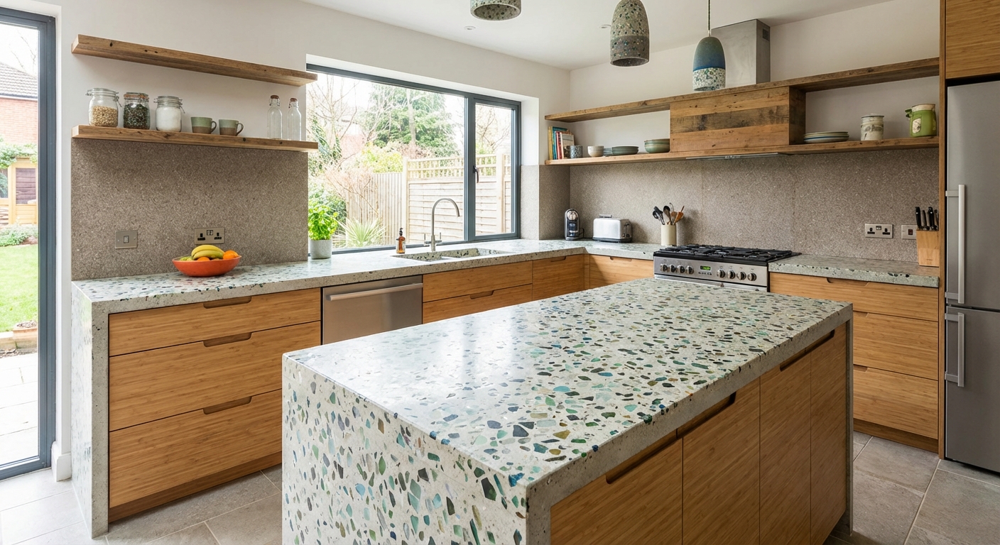 Visual Concept: Close-up of a terrazzo-style countertop made from recycled glass chips in muted greens and blues.