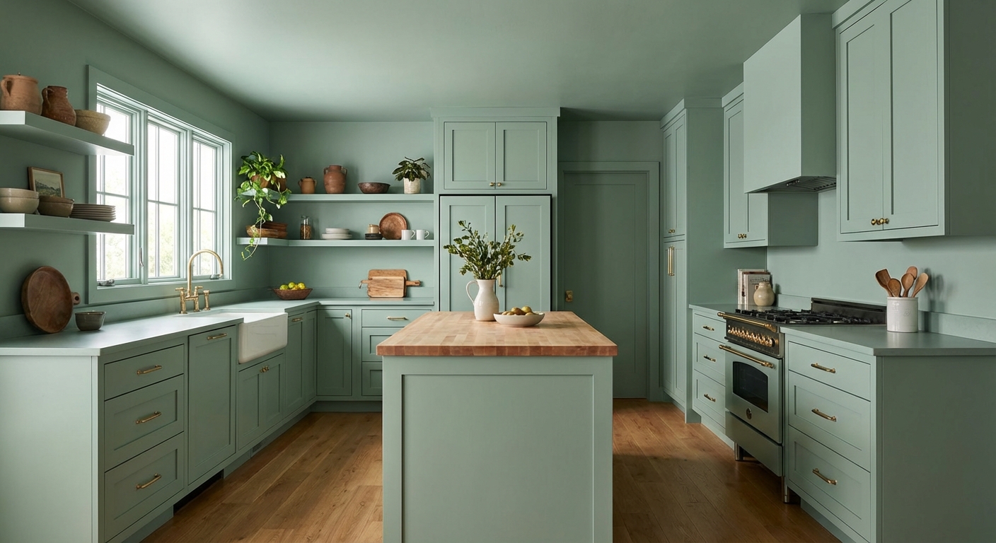Visual Concept: A kitchen where the walls, ceiling, and cabinets are all painted a soft, dusty sage green.