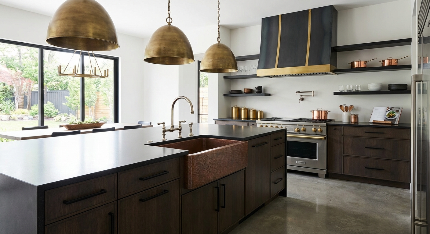 Gone are the days of matching every single handle and faucet. The trend now is to mix metals intentionally. Think Polished Nickel faucets paired with Aged Brass lighting, or Matte Black hardware with Copper sinks. It makes the kitchen feel curated over time rather than bought from a catalog.