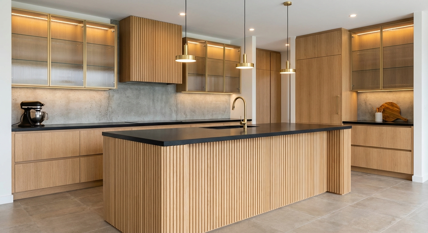 Visual Concept: A kitchen island wrapped in light oak fluted paneling, contrasting with smooth matte black countertops.